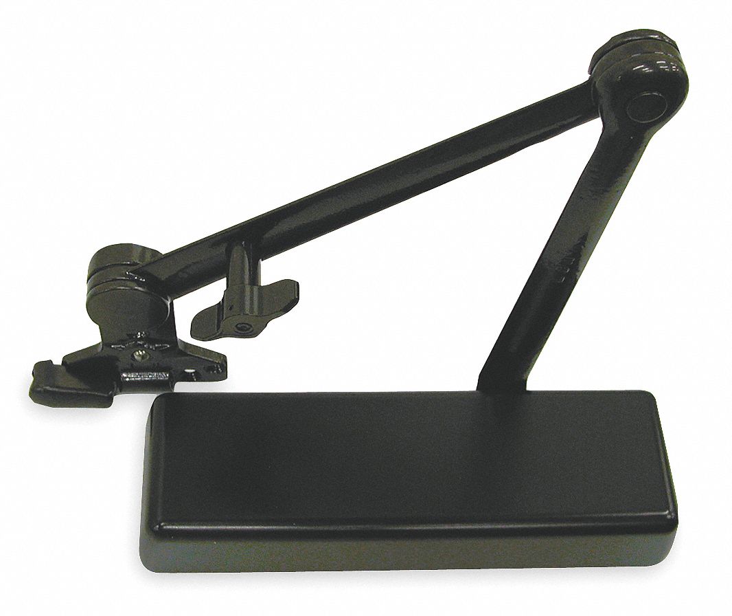 The closer features adjustable latching and closing speeds and a 180 degree opening range.