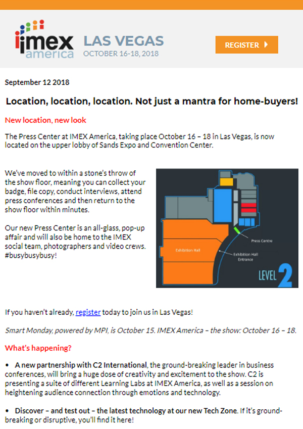 Imex america america s worldwide exhibition for incentive travel meetings events will take place october 16 18 2018 at the sands expo and convention center at the venetian the palazzo in las vegas preceded by smart monday powered by mpi on october 15.